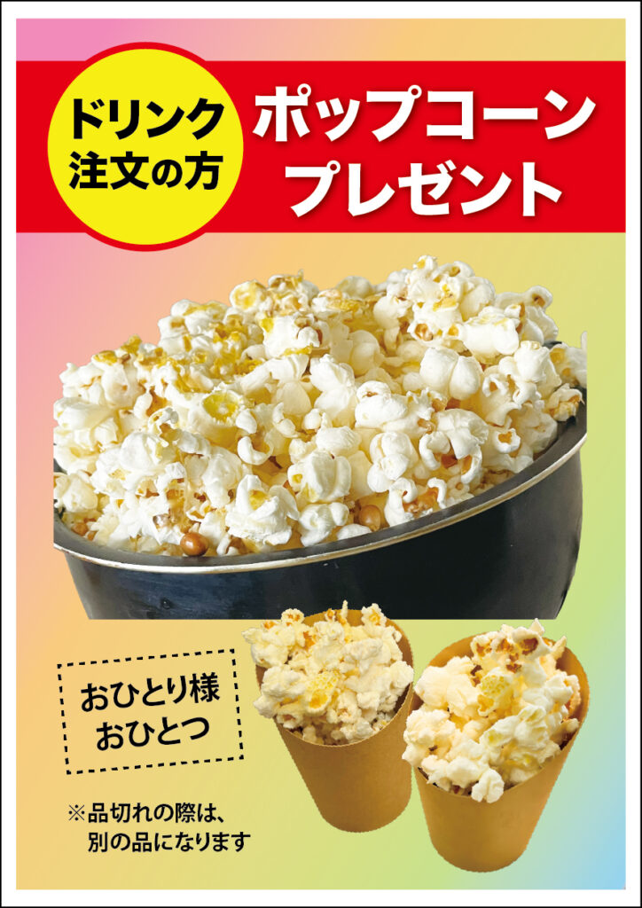 ドリンクご注文のお客様に、ポップコーンプレゼント!7月末まで。
