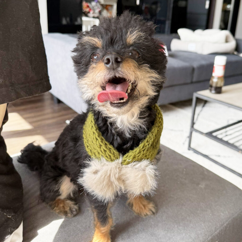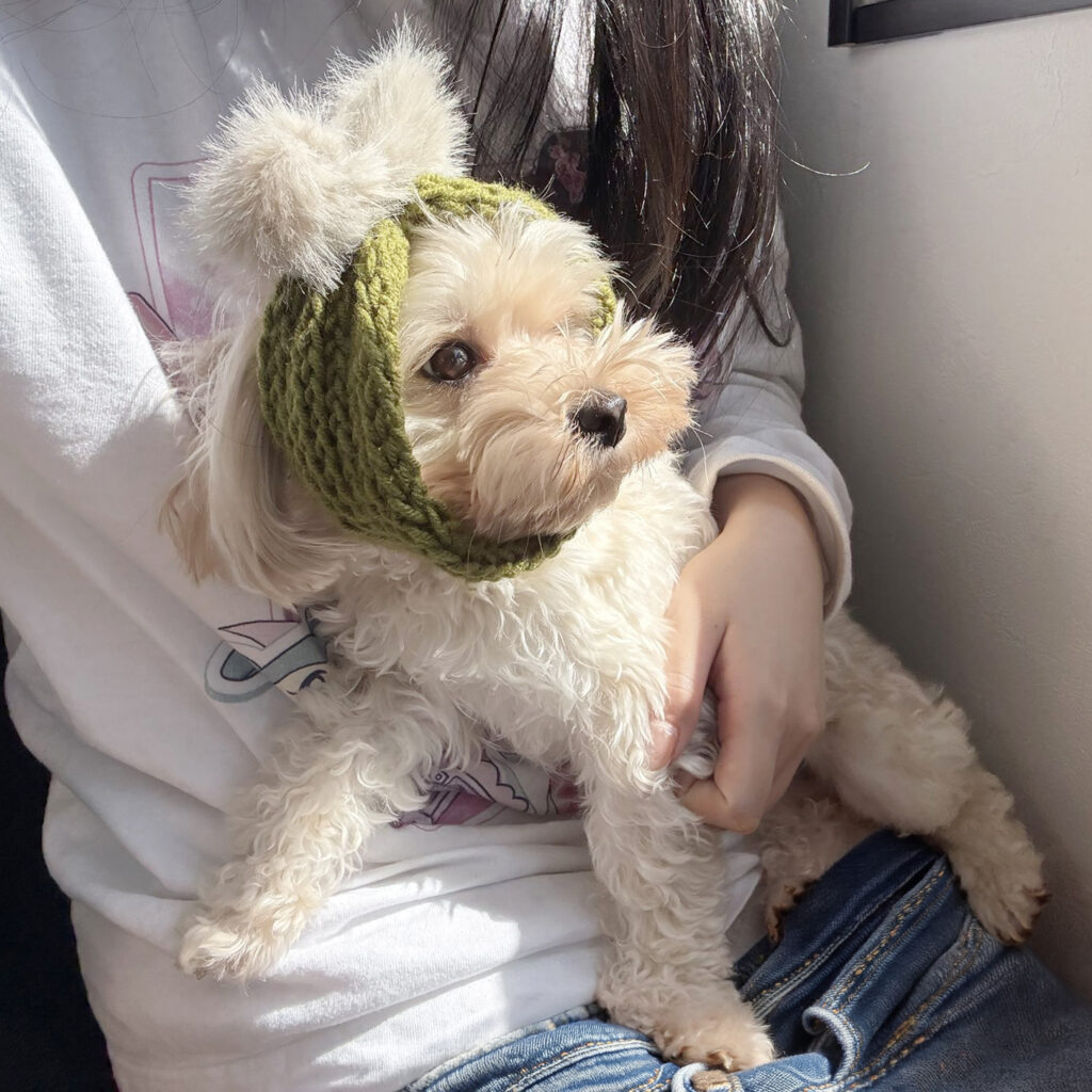 ネックウォーマー(330円)ご購入いただいたお客様より写真をいただきました!頭に巻いててかわいい!「モカちゃん、メス・2キロ(白)」「リズちゃん、メス・1.8キロ(黒)」